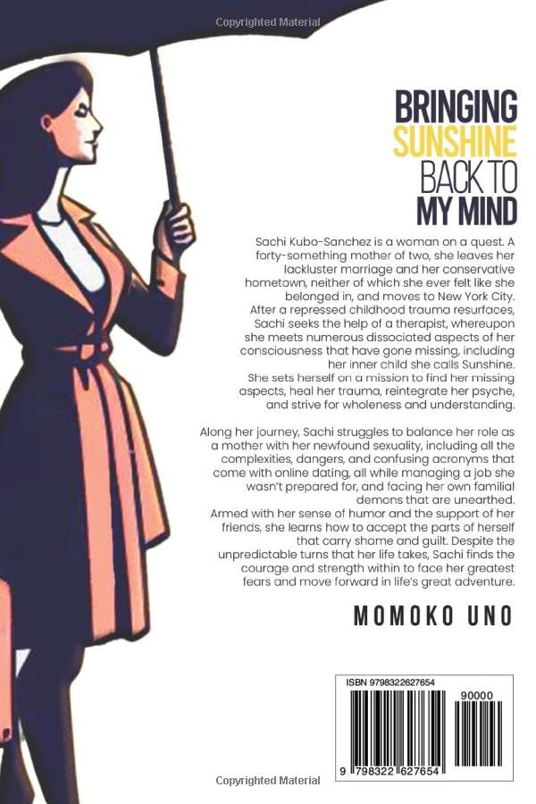 Sachi Kubo-Sanchez is a woman on a quest. A forty-something mother of two, she leaves her lackluster marriage and her conservative hometown, neither of which she ever felt like she belonged in, and moves to New York City. After a repressed childhood trauma resurfaces, Sachi seeks the help of a therapist, whereupon she meets numerous dissociated aspects of her consciousness that have gone missing, including her inner child she calls Sunshine. She sets herself on a mission to find her missing aspects, heal her trauma, reintegrate her psyche, and strive for wholeness and understanding.